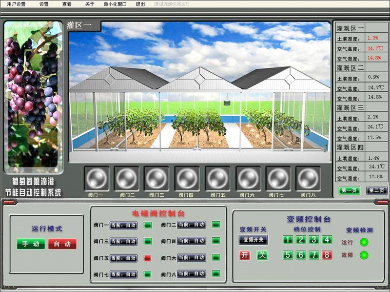 对于温室成片的农业园区,通过接收无线传感汇聚节点发来的数据,进行存储、显示和数据管理,可实现所有基地测试点信息的获取、管理和分析处理,并以直观的图表和曲线方式显示给各个温室的用户,同时根据种植植物的需求提供各种声光报警信息和短信报警信息,实现温室集约化、网络化远程管理。